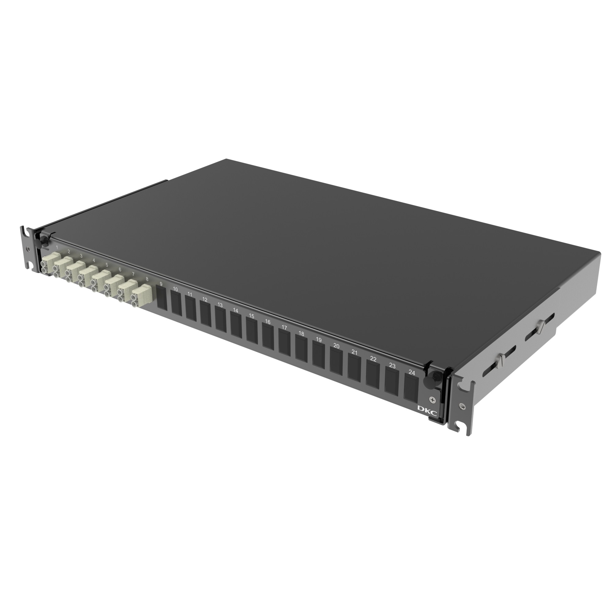19'' Fiber optic slided patch panel 8 Duplex LC/UPC OM2 with splice-plate(s), FSPS, pig tails, FO adapters