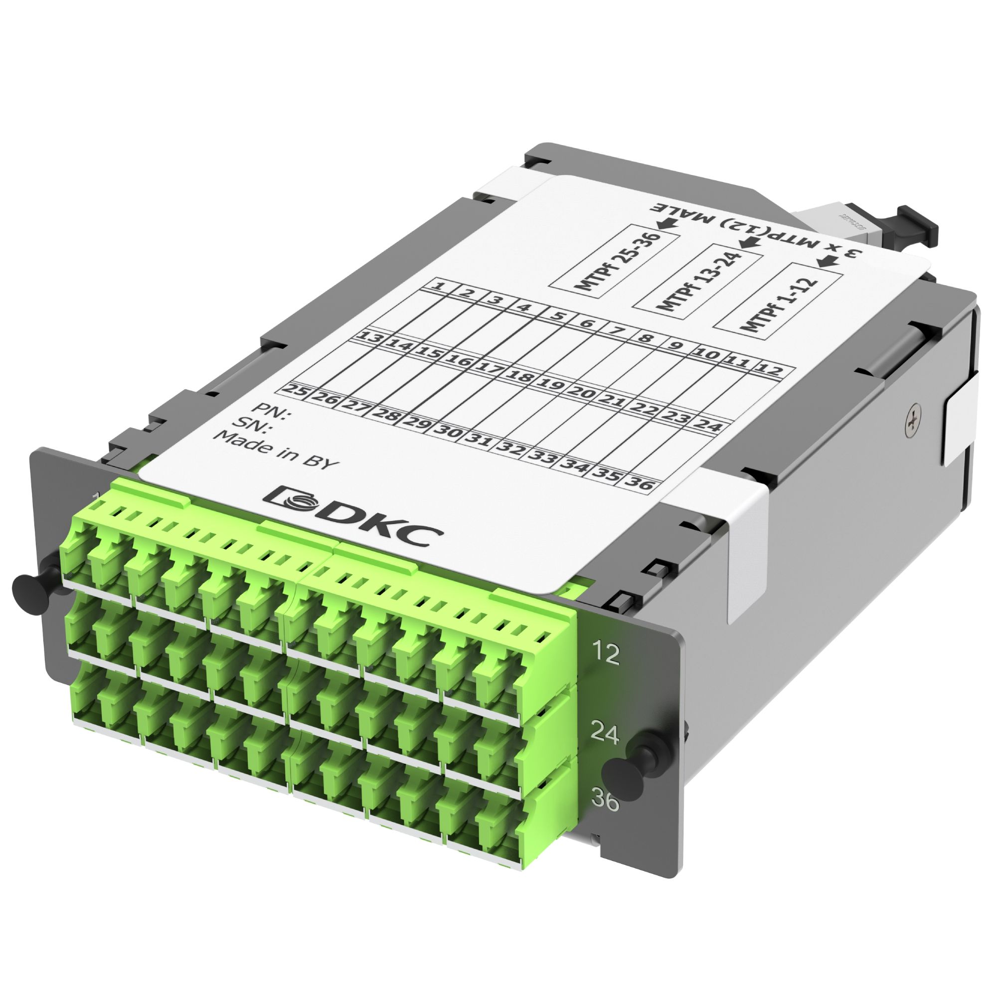 Preterminated cassette 36 FO OM5, 3xMTP(12)f/18xLC-UPC Duplex with shutters, 1 HU