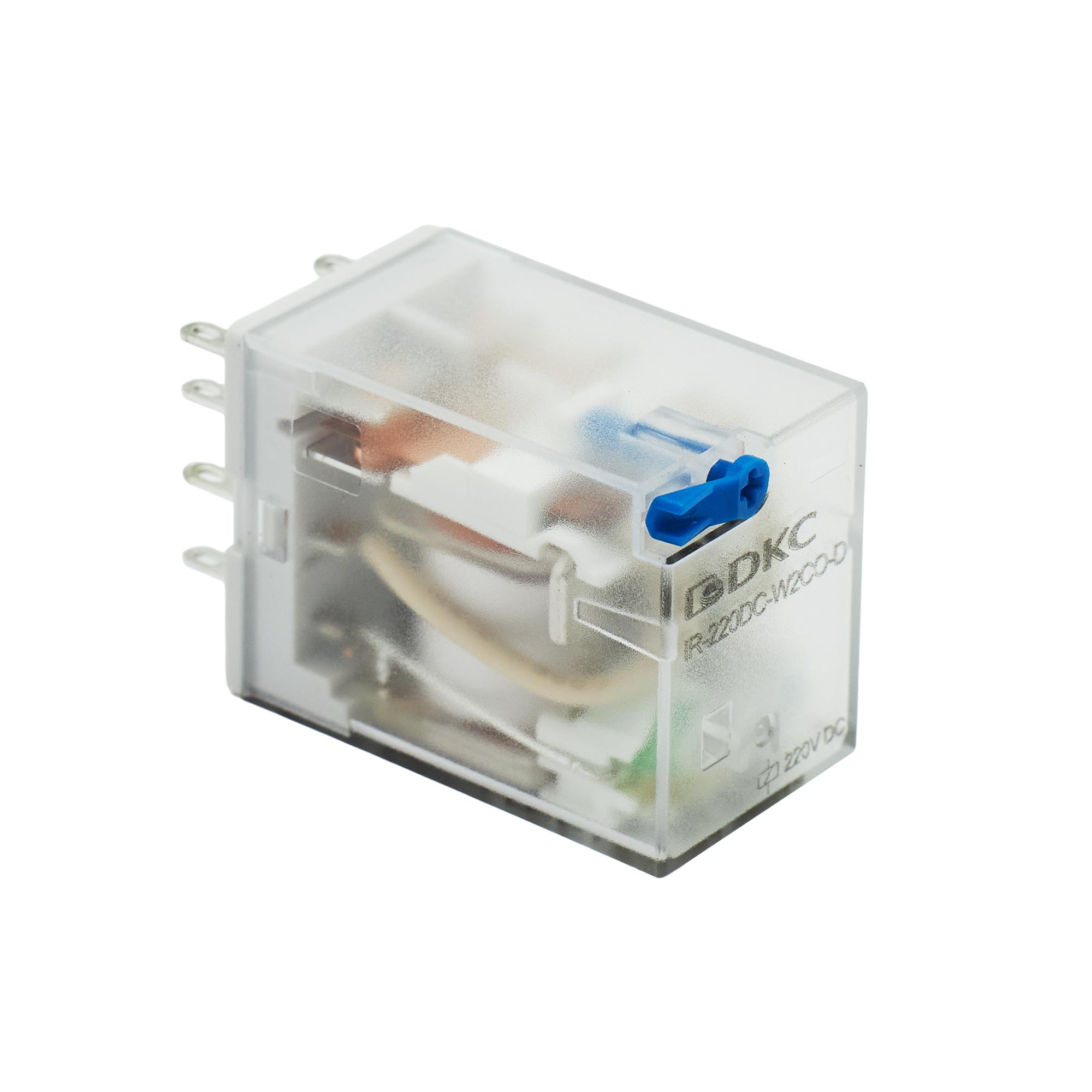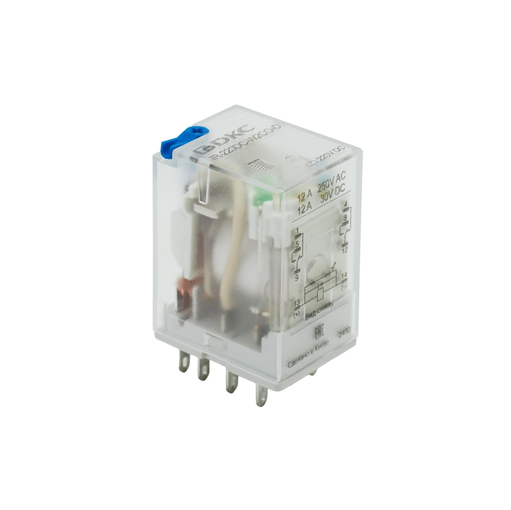 Industrial single relay with 0.6Un coil tuned, 2CO, 12A, LED+Diode+Test button, 220V DC