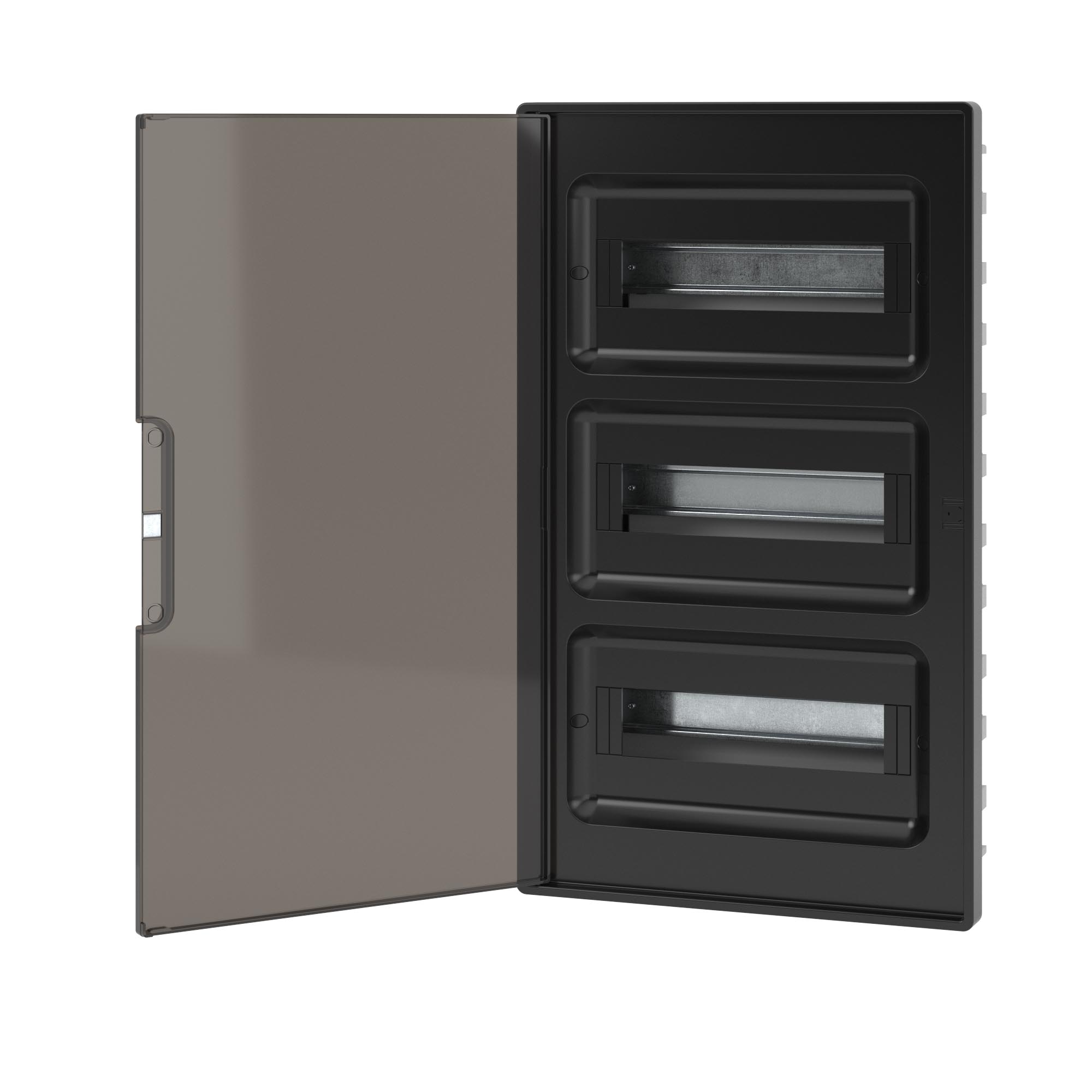 Plastic shield 36 modules, built-in, for hollow walls FRAME, black, with tinted door, with 4 PEN busbar 8+10 holes