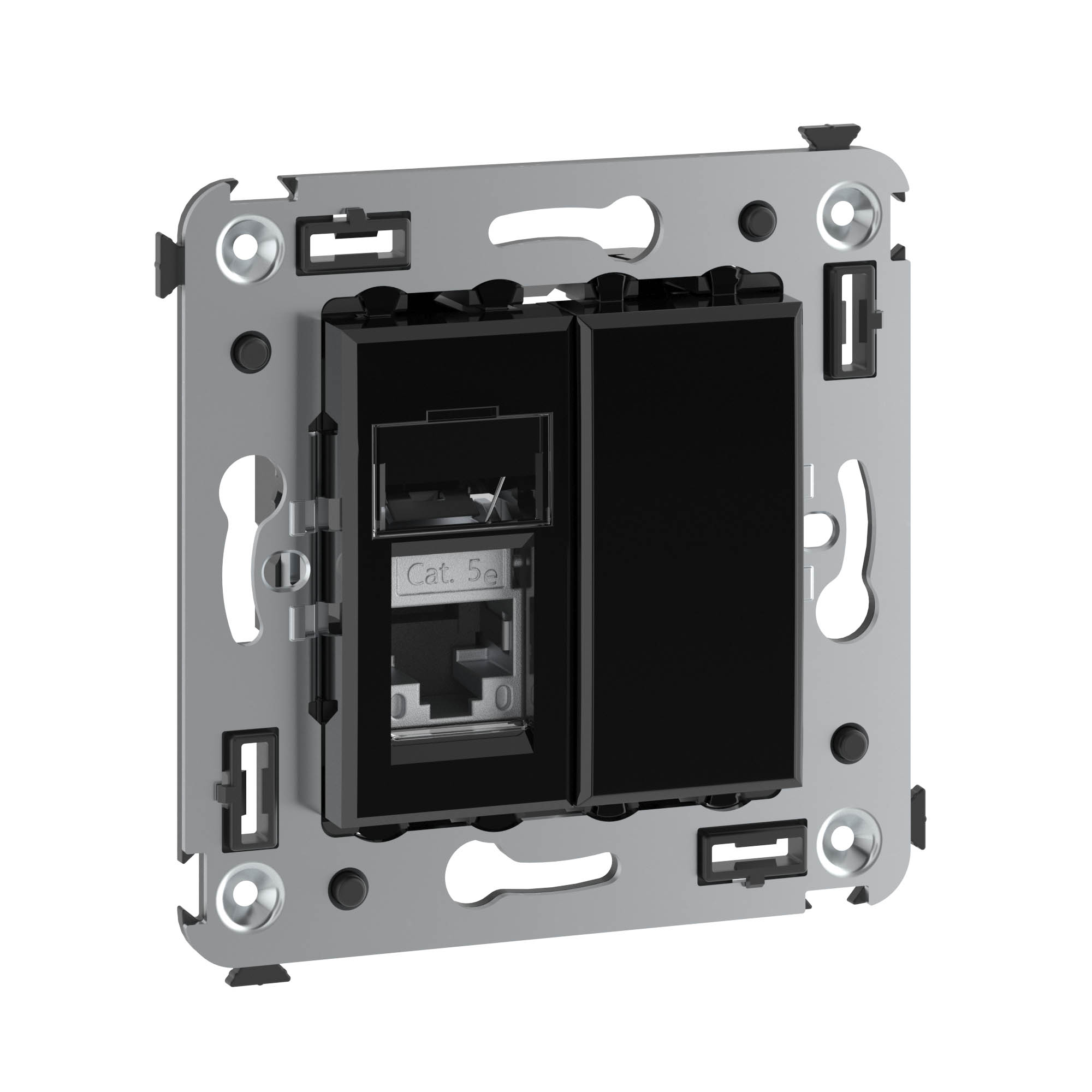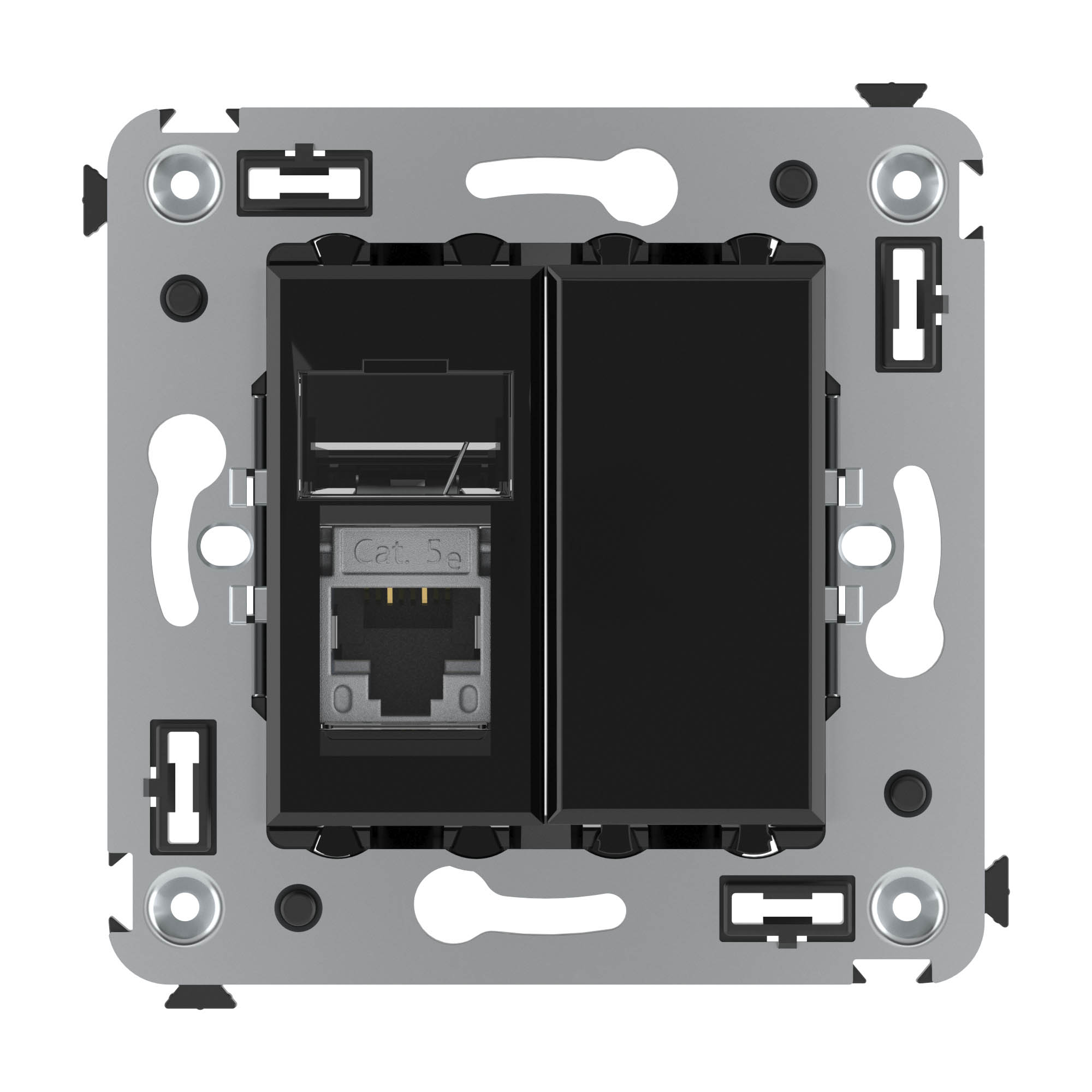 Компьютерная розетка одинарная экранированная используется для подключения компьютерной техники и соединения с патч-панелью. Компьютерная розетка предназначена для скрытого монтажа в стену, поставляется в комплекте с суппортом. Розетка RJ-45 категории 5e – это наиболее популярная на сегодняшний день модель. Она позволяет организовать сеть с частотой 125 МГц и скоростью до 1000 Мбит/с. Материал – металл, термопласт. Пластиковые детали устройства имеют оттенок "Черный квадрат".