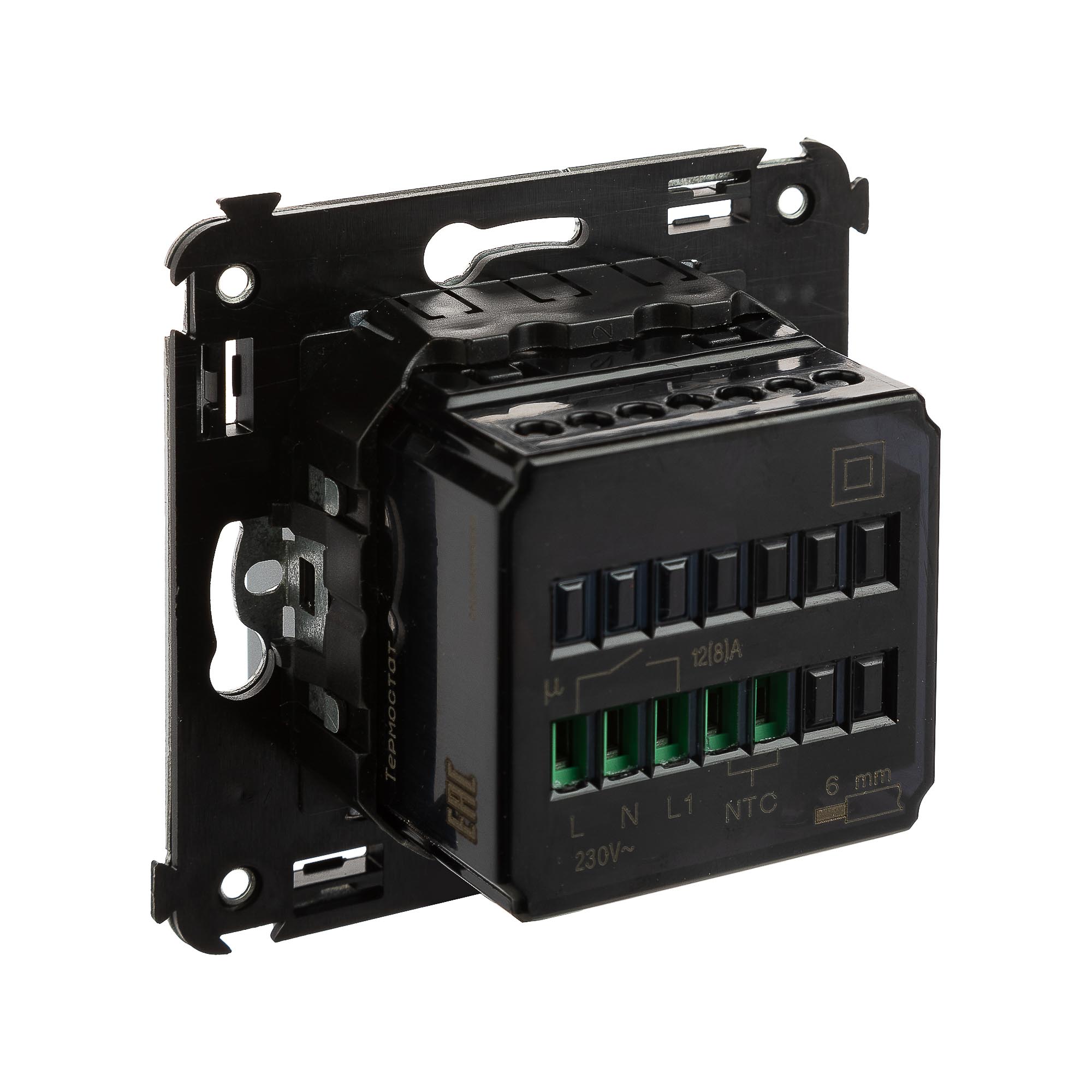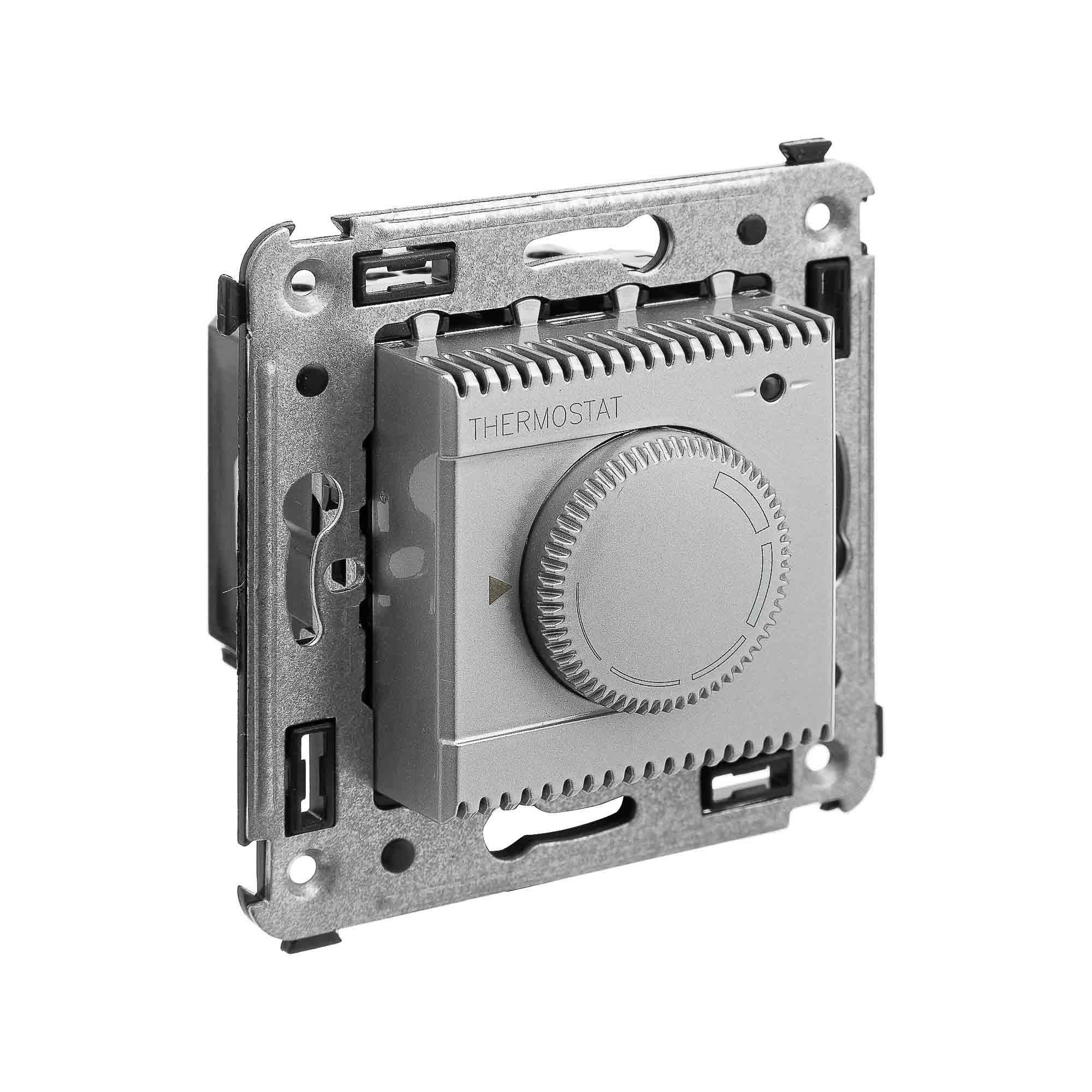 Термостат для теплых полов. Назначение: для монтажа в подрозеточные коробки глубиной не менее 45 мм (код 59301);. Предназначен для управления теплыми полами. Характеристики: диапазон от 5 до 30 °С; частота – 50–60 Гц; номинальное напряжение – 230 В; лампа-индикатор включается, когда температура в комнате падает ниже выбранного значения; нагрузка: 12 A – cosφ=1; 4,8 A – cosφ=0,4; фиксация в подрозеточные коробки глубиной не менее 45 мм при помощи каркаса с лапками (код 4400802) и саморезов; провод датчика температуры в комплекте (длина 3,5 метра). Цвет: "Закаленная сталь".
