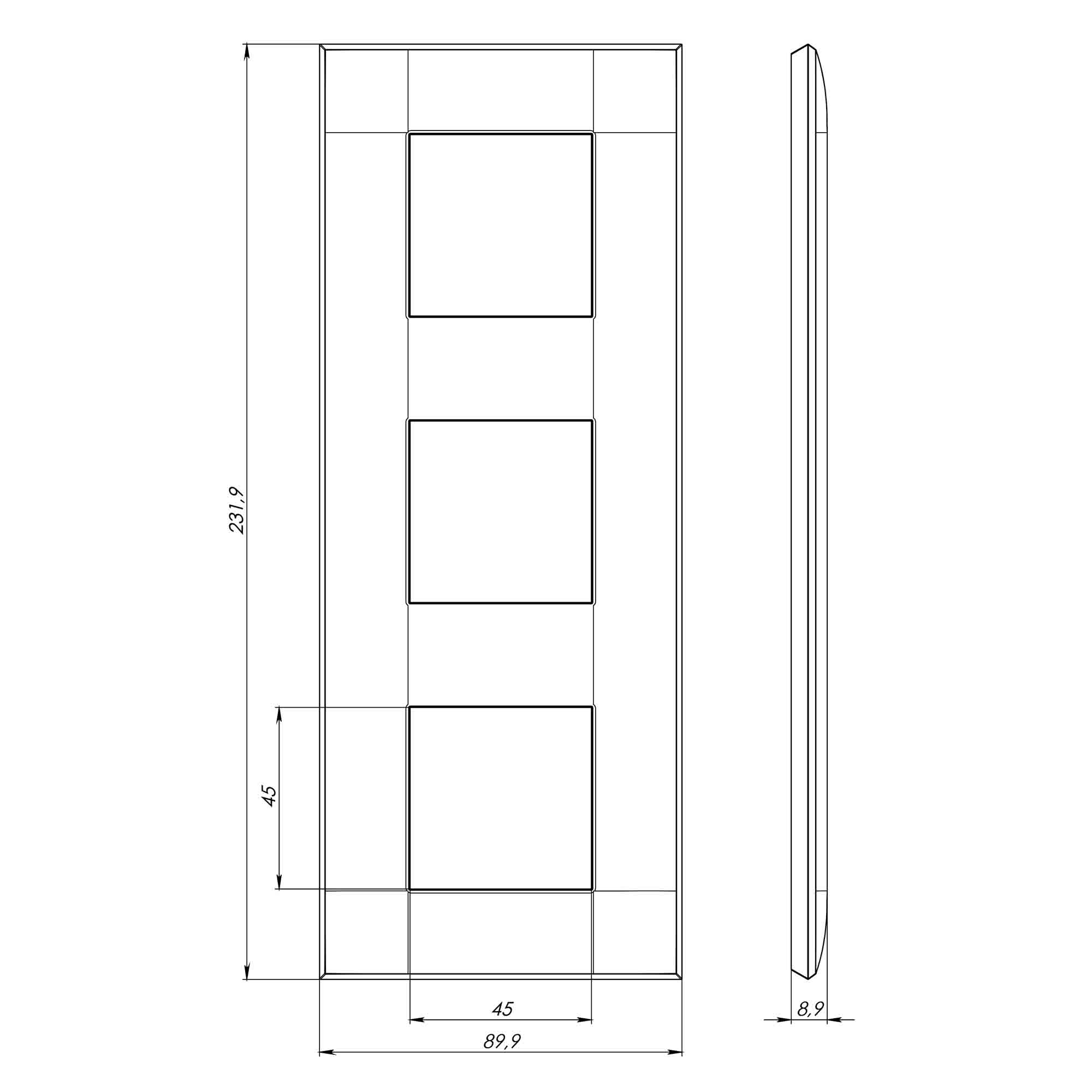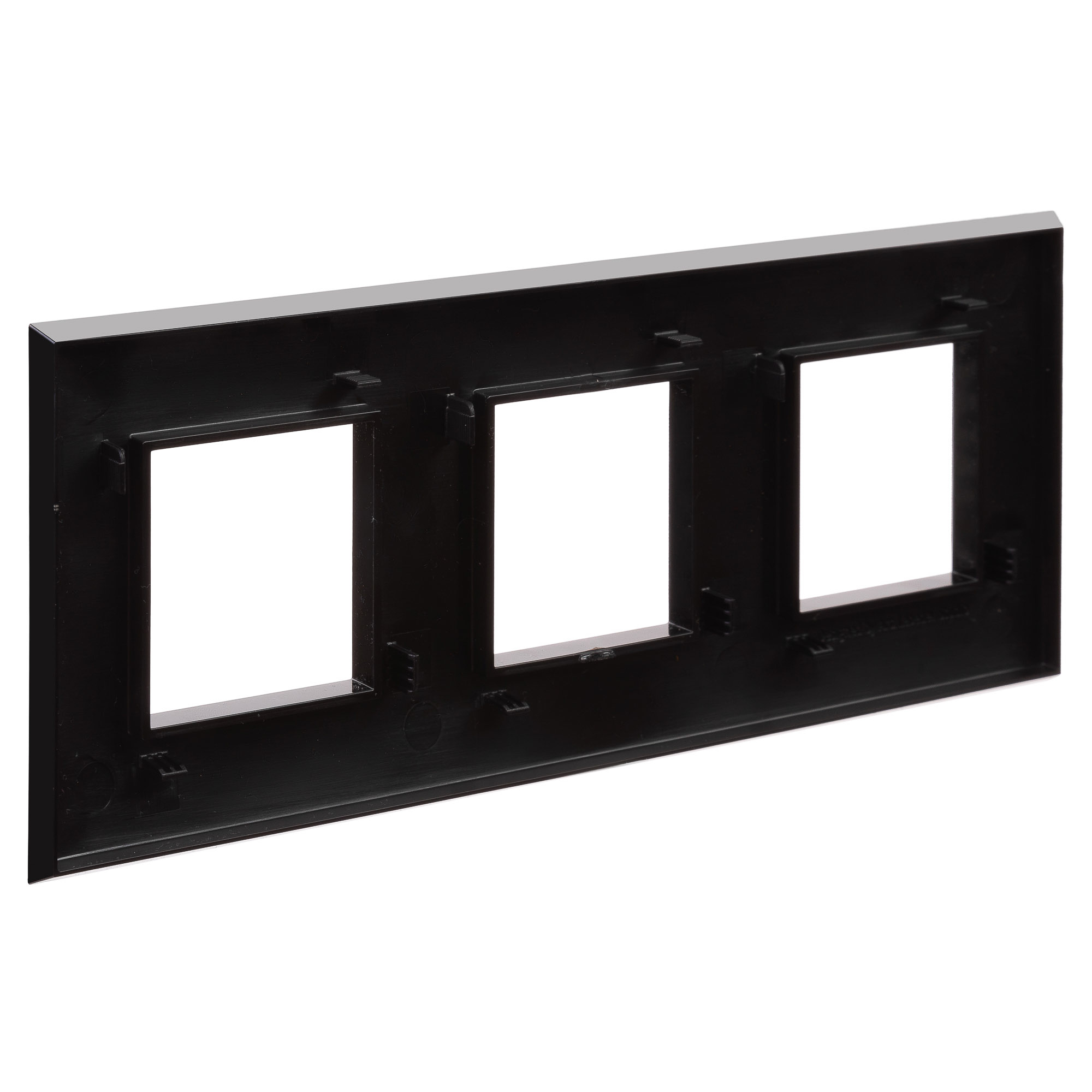 Рамка имеет 3 места под электроустановочные изделия (максимальная вместимость – 6 модулей) и может размещаться как горизонтально, так и вертикально. Габаритные размеры: 235х90 мм. Материал – термопласт.