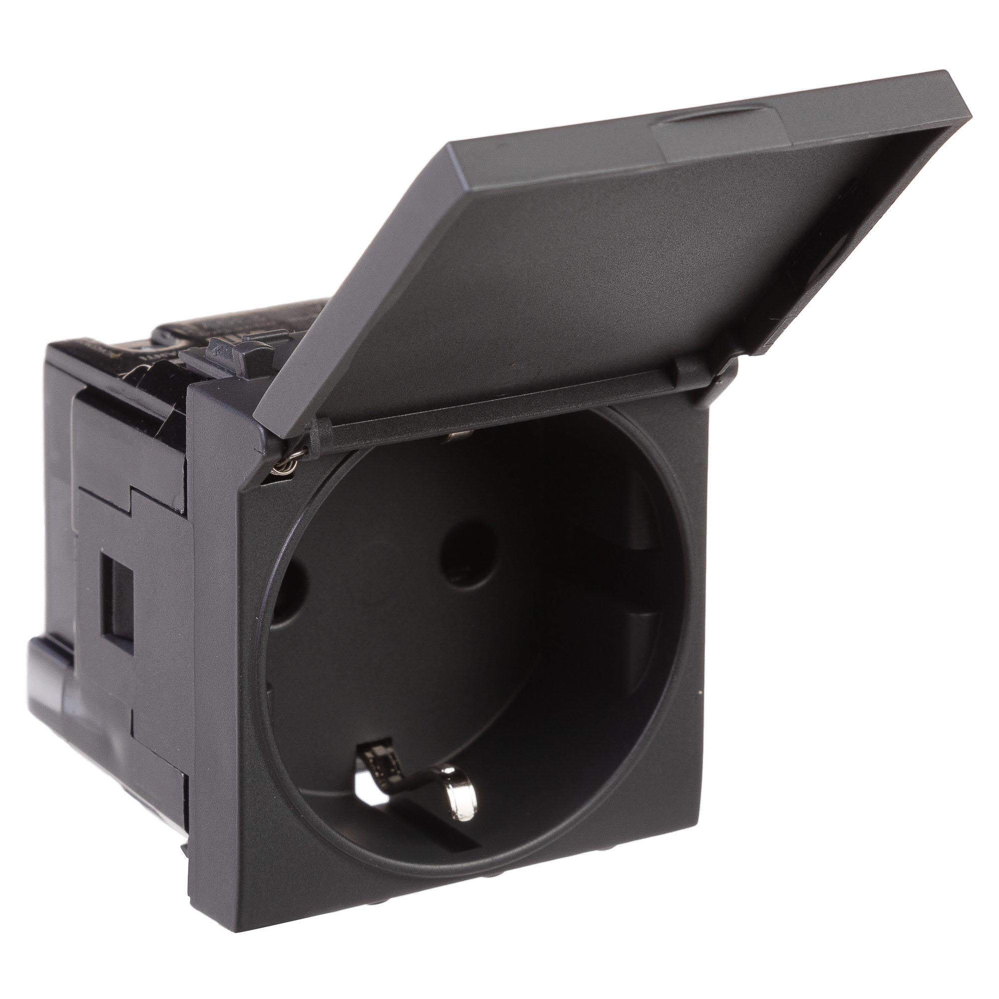 Розетка с крышкой модульная, 2P+E, с з/ш, Avanti, черный матовый, 2модуля