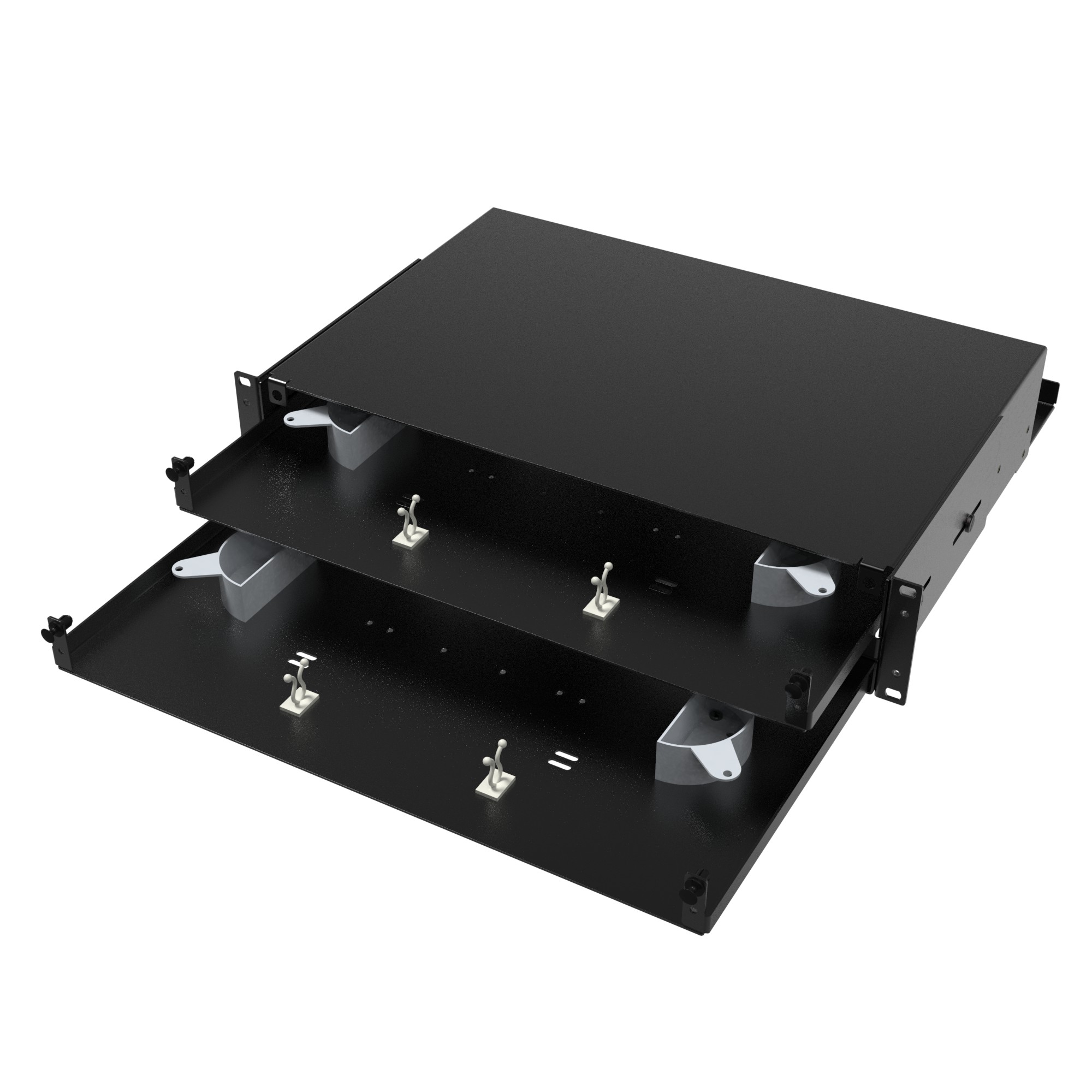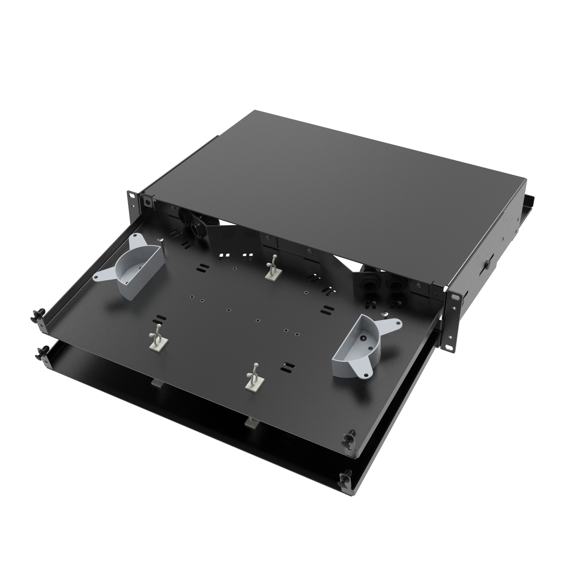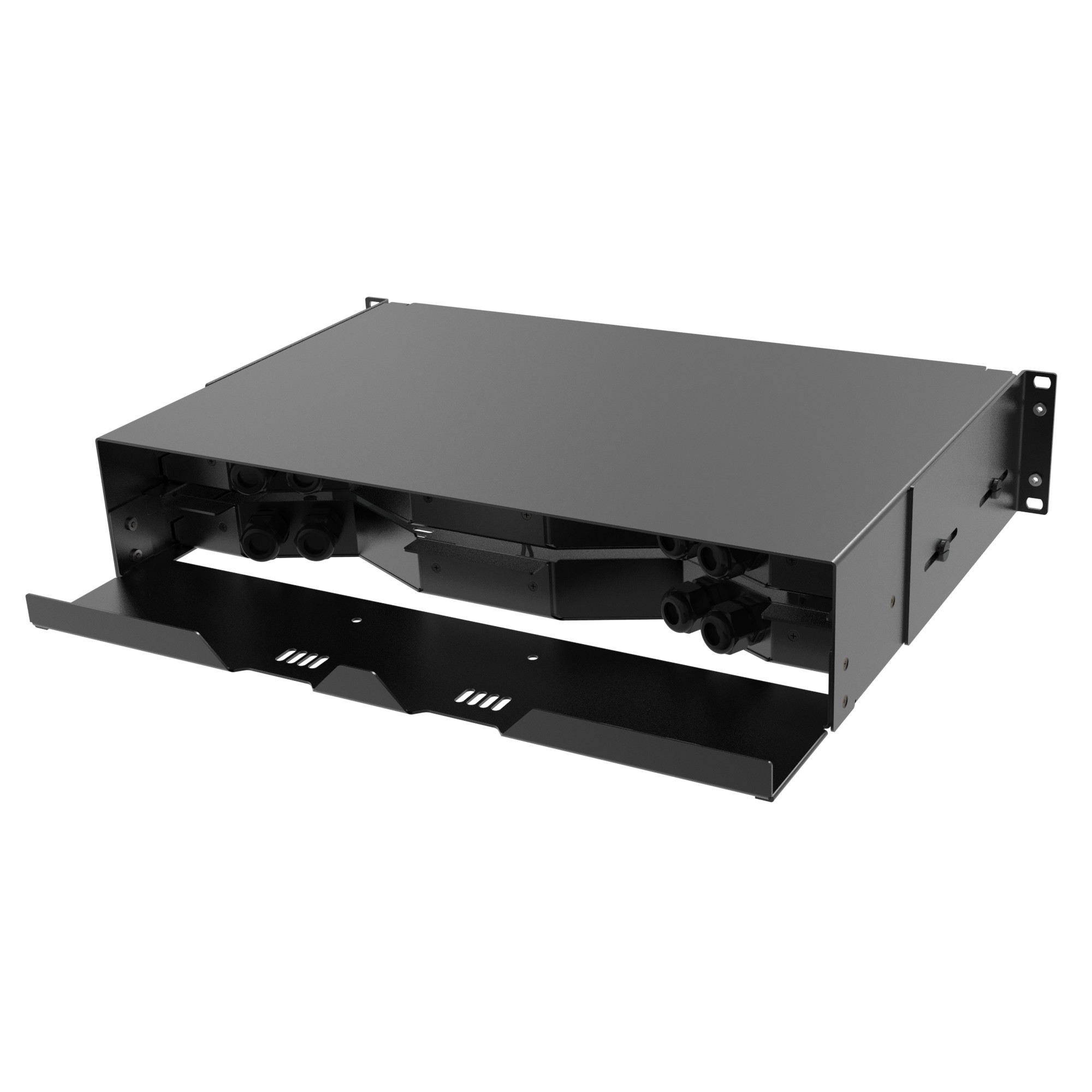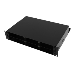 Оптический бокс представляет собой 19” конструктив с выдвижной панелью, на которой располагются сплайс-кассеты (от 1 до 4, в зависимости от типа сплайс-кассеты, приобретаются дополнительно) и уложены соединительные трубки сваренных оптических волокон. С обратной стороны оптического кросса организованы 4 ввода кабеля. Крепежные уголки 19” конструктива позволяют регулировать глубину посадки оптической полки в коммутационном шкафу. Высота оптического бокса - 2U.