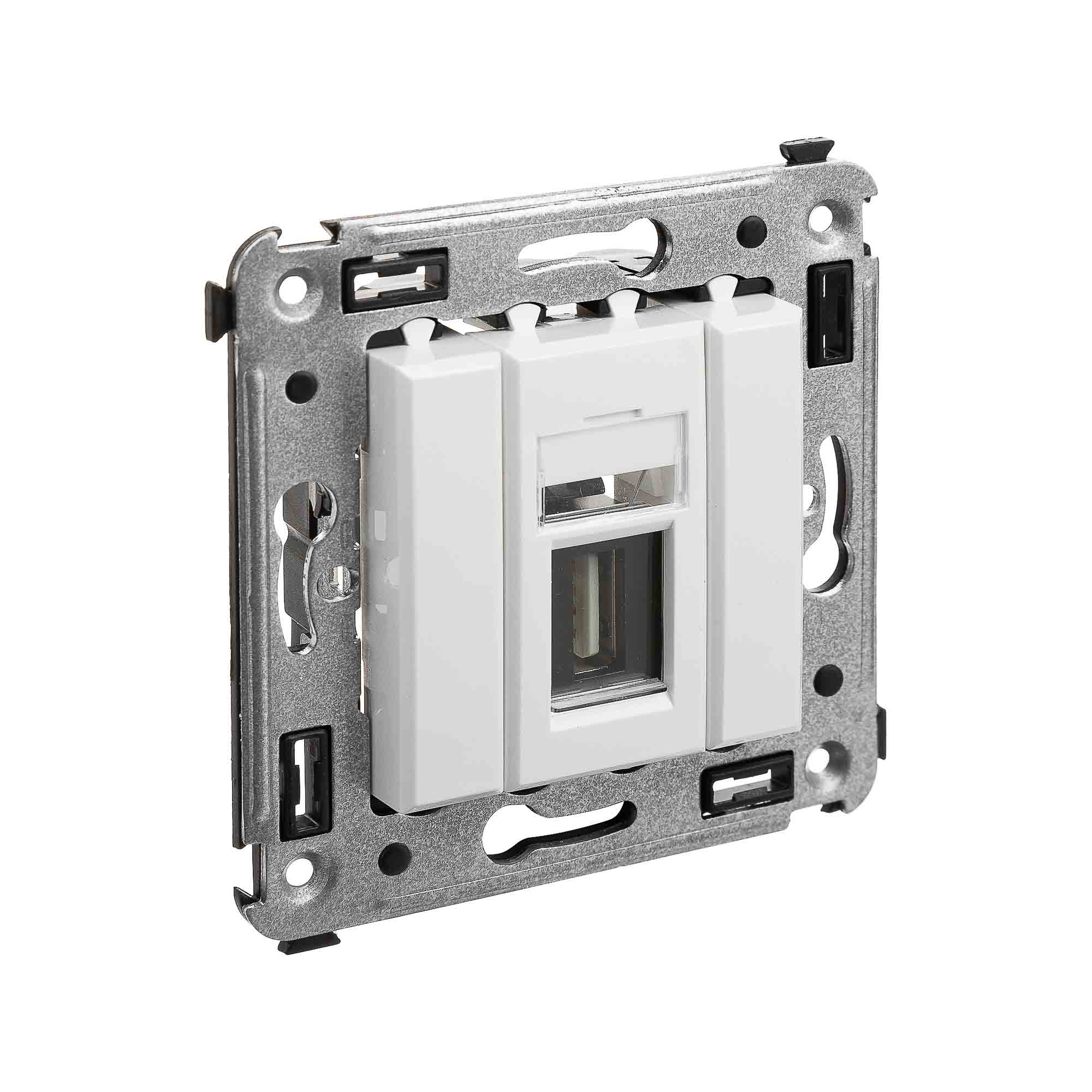 USB 2.0 розетка. Назначение: для монтажа в подрозеточные коробки глубиной не менее 45 мм (код 59301). Используется в качестве информационной розетки для передачи сигнала (подключение проекторов, мониторов и др.). 1 модуль. Цвет: "Белое облако". Производитель оставляет за собой право вносить во внешний вид изделия изменения, которые не влияют на его функционал, безопасность и надежность.