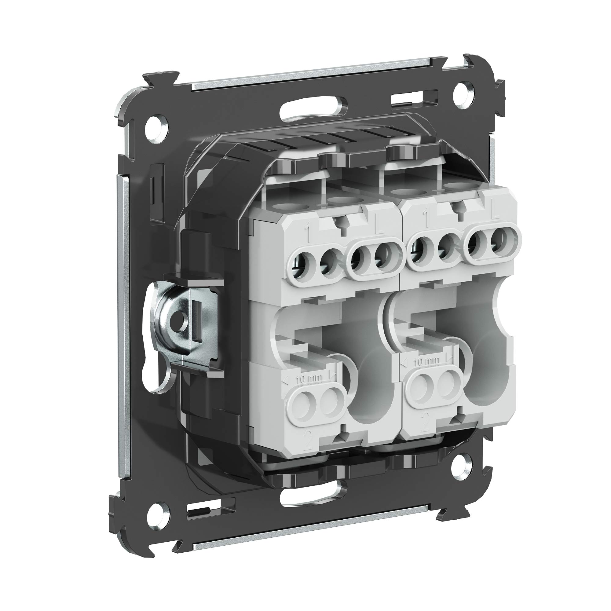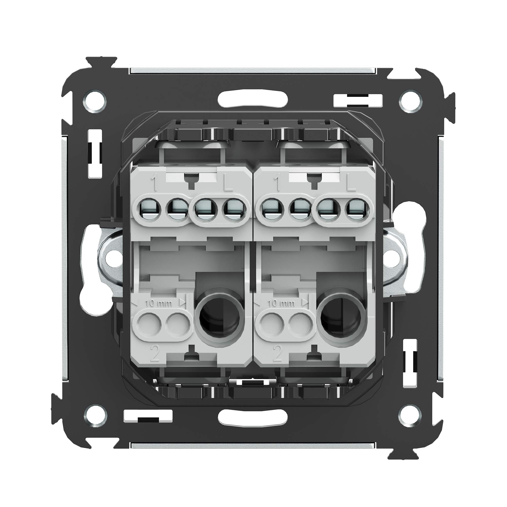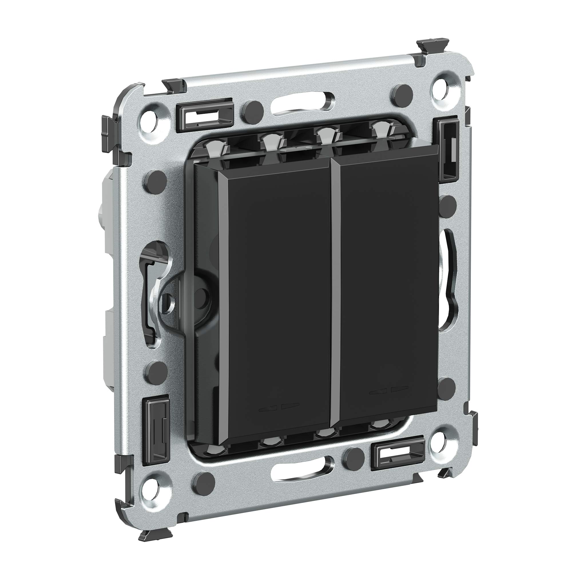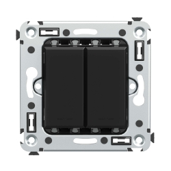 Кнопка двухклавишная. Назначение: для монтажа в подрозеточные коробки глубиной не менее 45 мм (код 59301). Используется в качестве кратковременного включения источника питания энергией. Характеристики: 2 модуля, диаметр отверстий для ввода кабелей – 3 мм (по 2 отверстия на одну клемму); винтовые зажимы; шаблон для зачистки кабеля – 11 мм; номинальный ток – 10 A; номинальное напряжение – 230 В; фиксация в подрозеточные коробки при помощи каркаса с лапками (код 4400802) и саморезов. Цвет: "Черный квадрат".