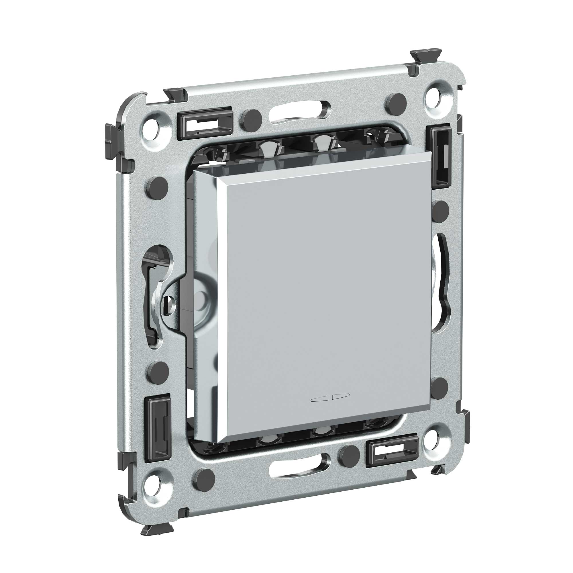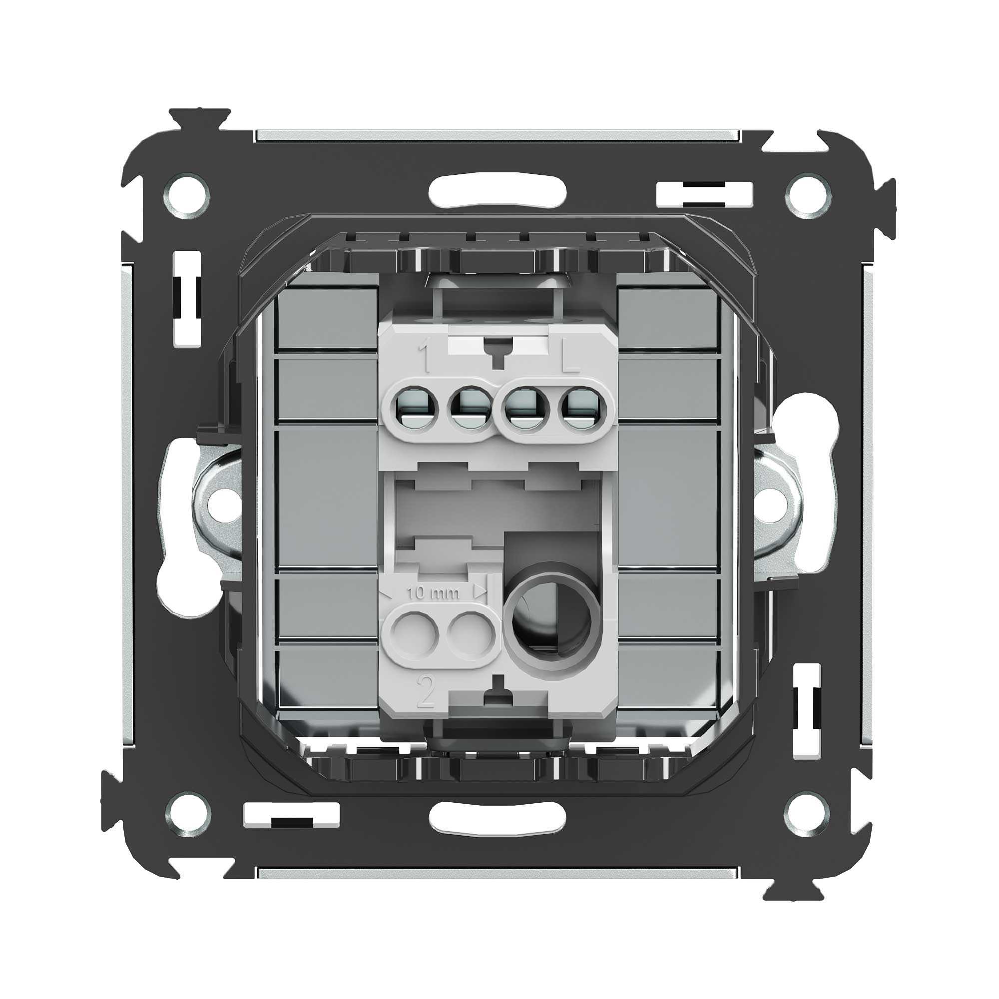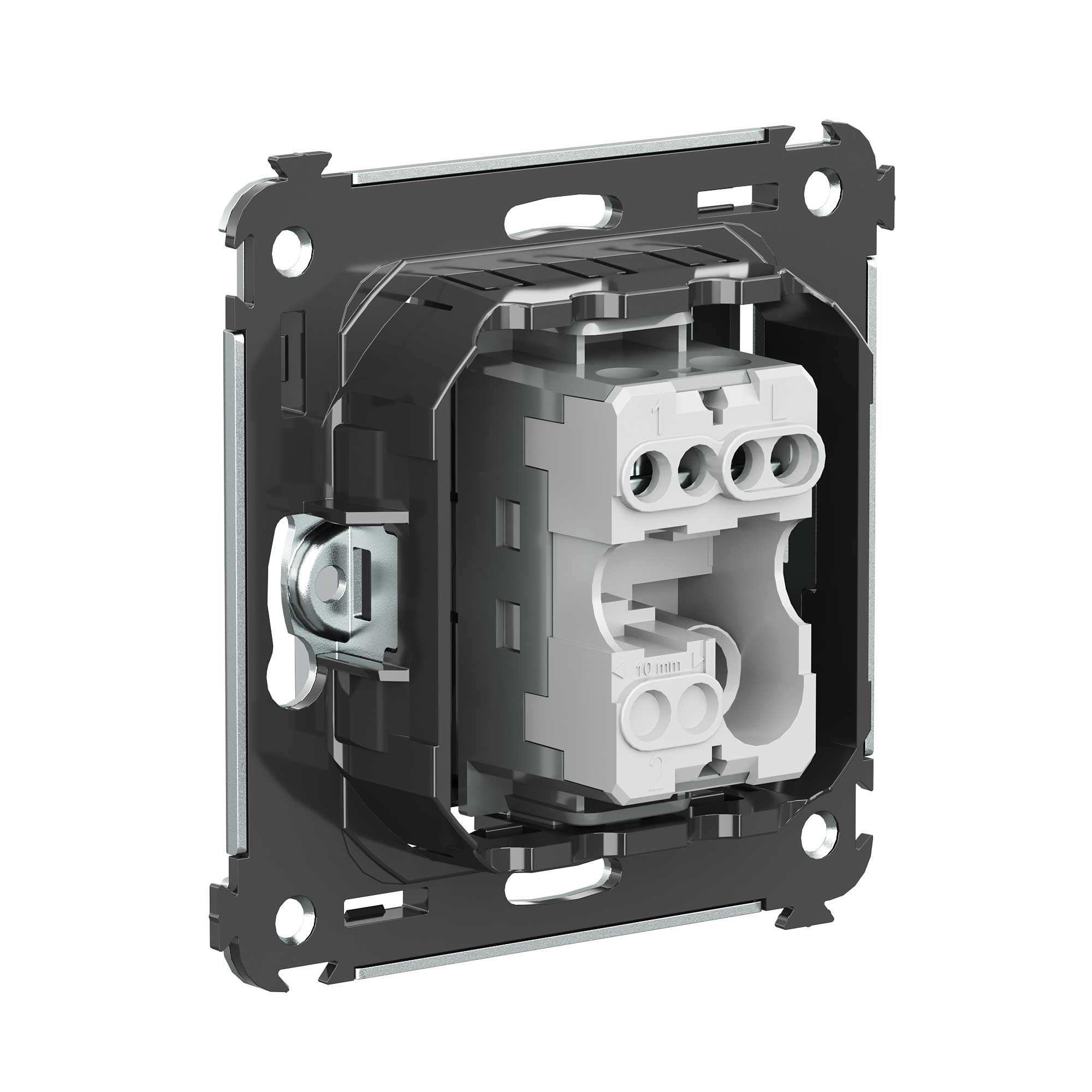 шаблон для зачистки кабеля – 11 мм; номинальный ток – 10 A; номинальное напряжение – 230 В; фиксация в подрозеточные коробки при помощи каркаса с лапками (код 4400802) и