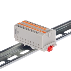 Распределительный блок с push-in зажимом и вертикальным адаптером предназначен для удобного и безопасного распределения потенциала между несколькими цепями. Имеет один ввод для проводников сечением 6 мм² и восемнадцать точек подключения по 2,5 мм². Монтаж выполняется без инструмента, установка возможна на DIN-рейку шириной 15 или 35 мм. Корпус изготовлен из полиамида 6.6 с классом горючести V0 по UL-94, обеспечивающего надежность и термостойкость. Габариты (В×Ш×Г) — 21,7×56,9×28,8 мм, цвет — синий.