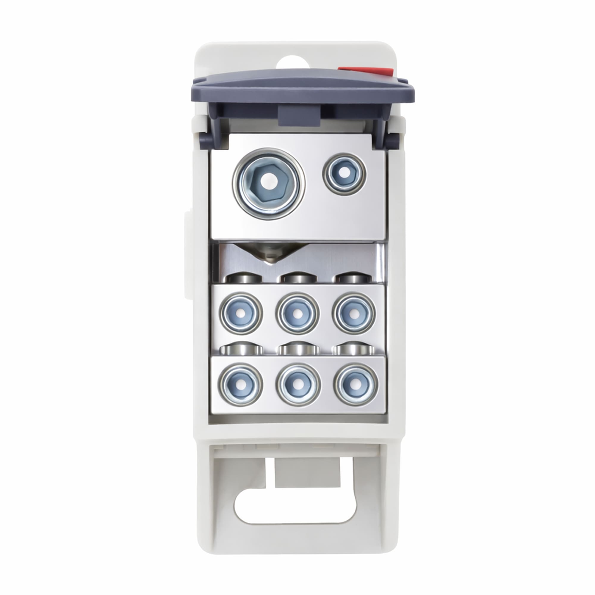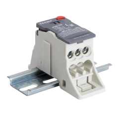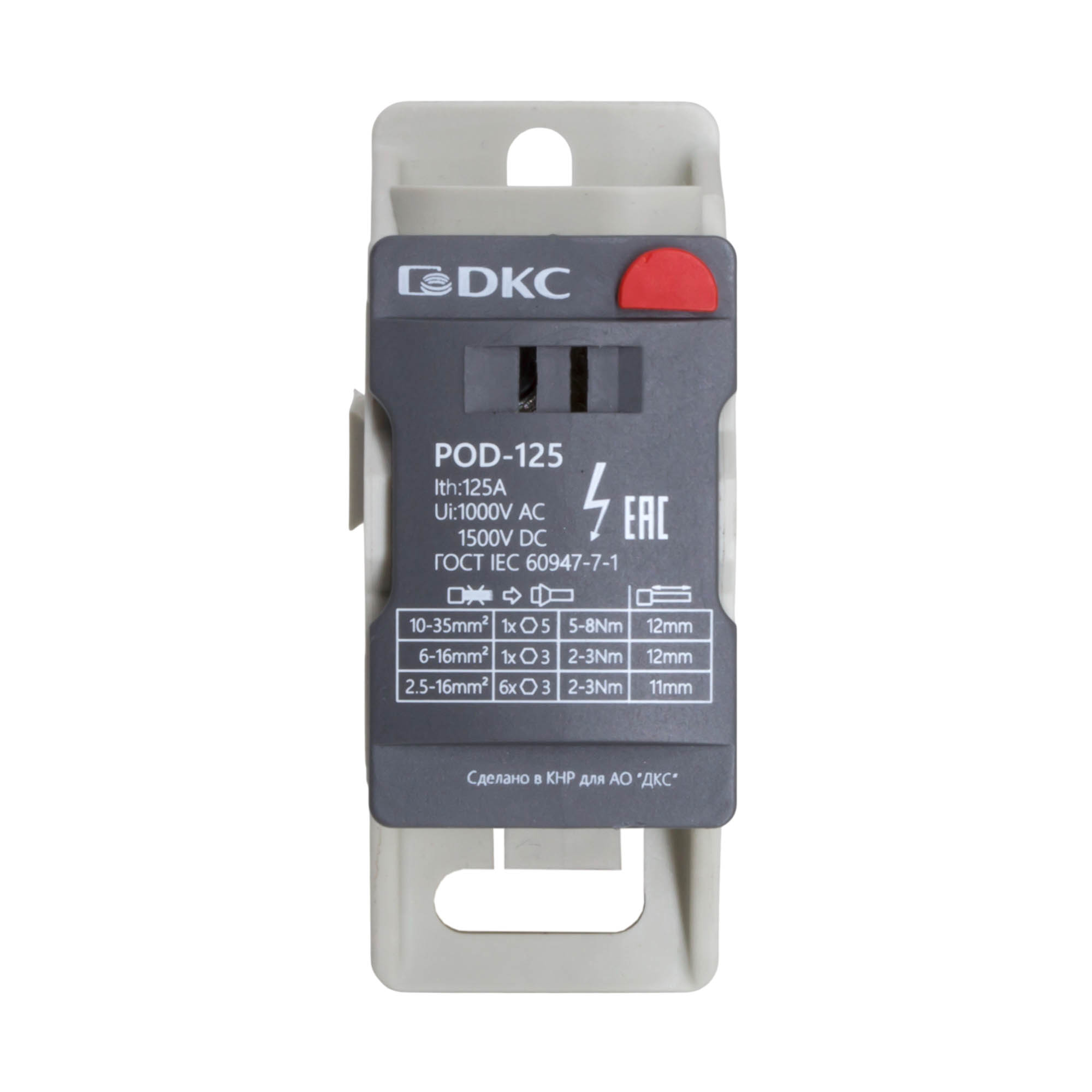 Распределительный блок POD-125 с винтовым зажимом служит для соединения и распределения многожильных или обжатых наконечником гибких проводников в электрических щитах. Установка на DIN-рейку высотой 35 мм или монтажную плату. Боковой штифт обеспечивает стыковку блоков между собой. На крышке распределительного блока нанесена ключевая информация, а также есть паз для маркировки NUTB5. В комплект входит цветная пластиковая маркировка (синий, зеленый, красный, желтый) и самоклеящаяся (L1, L2, L3, N, заземление, круг). Корпус выполнен из полиамида с классом горючести V0 UL-94. Степень защиты – IP20. Цвет – серый, 1 ввод с сечением 10-35 мм2, 7 точек подключения (выводов) с номинальным сечением проводников 2,5-16 мм2. Габариты (В×Ш×Г) – 48,5×31,1×76,5 мм.