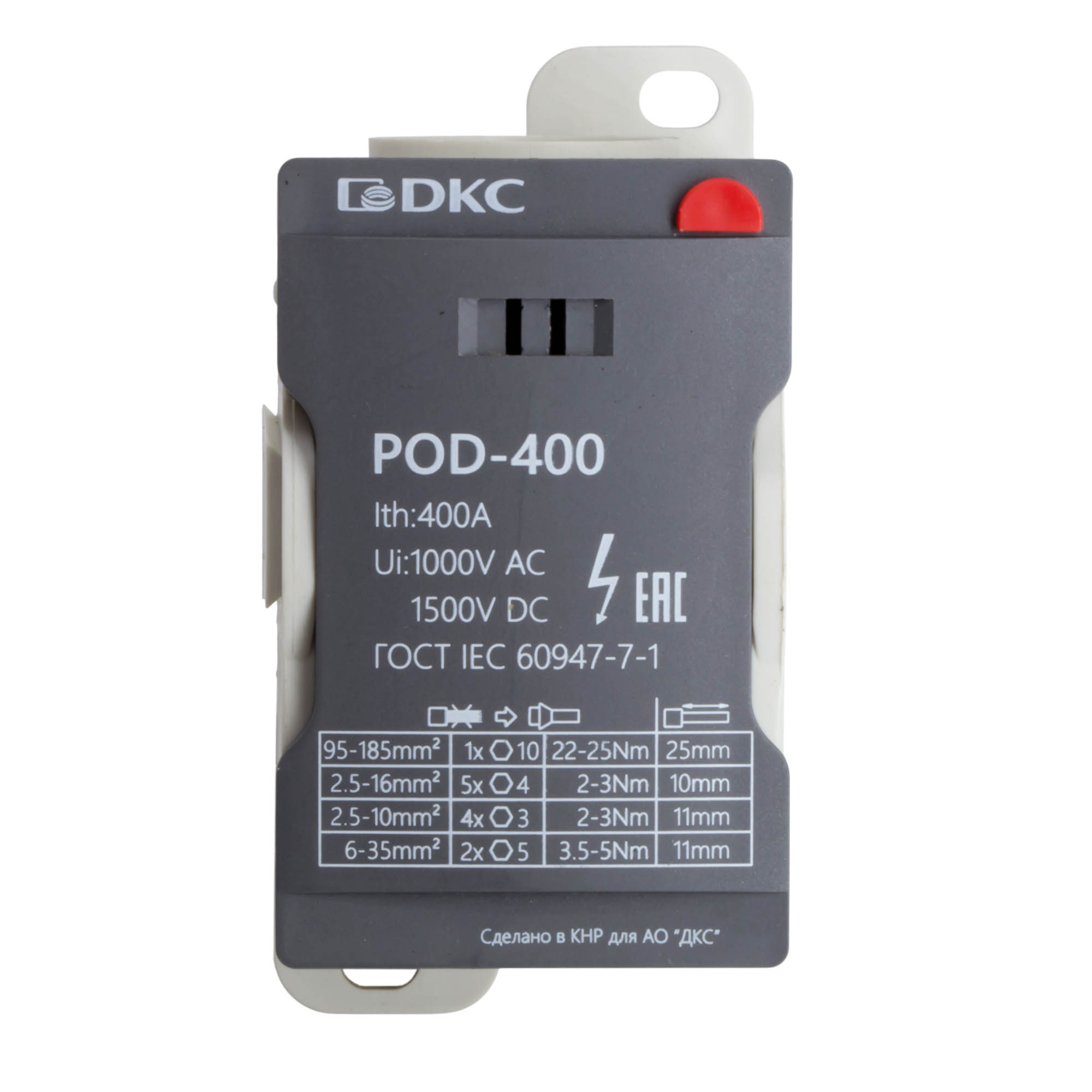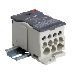 Распределительный блок POD-250 с винтовым зажимом служит для соединения и распределения многожильных или обжатых наконечником гибких проводников в электрических щитах. Установка на DIN-рейку высотой 35 мм или монтажную плату. Боковой штифт обеспечивает стыковку блоков между собой. На крышке распределительного блока нанесена ключевая информация, а также есть паз для маркировки NUTB5. В комплект входит цветная пластиковая маркировка (синий, зеленый, красный, желтый) и самоклеящаяся (L1, L2, L3, N, заземление, круг). Корпус выполнен из полиамида с классом горючести V0 UL-94. Степень защиты – IP20. Цвет – серый, 1 ввод сечением 95-185 мм2, 11 точек подключения (выводов) с номинальным сечением проводников 2,5-35 мм2. Габариты (В×Ш×Г) – 51,5×49×96,5 мм.