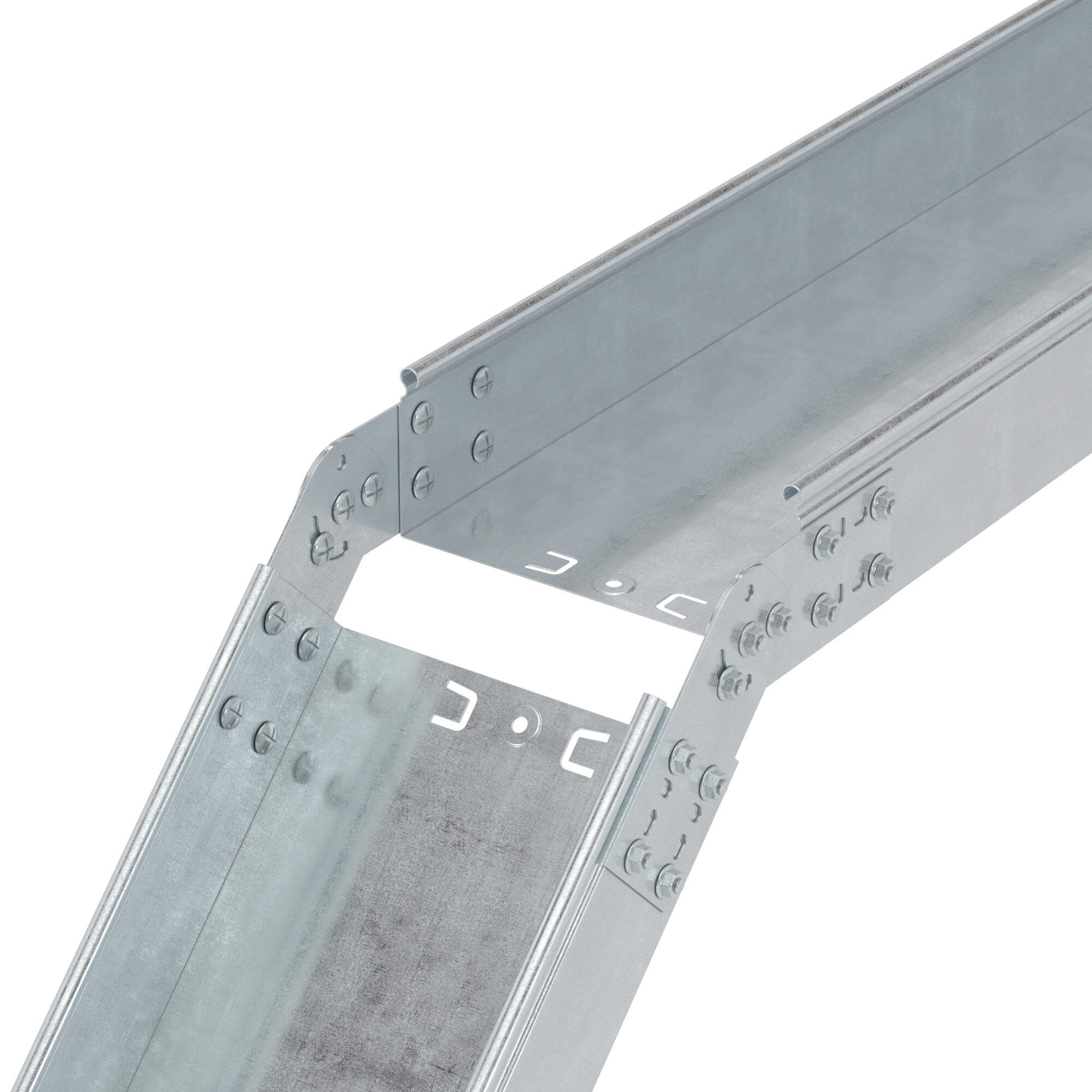 Система листовых лотков "S5 Combitech" включает в себя не только сами лотки, но также аксессуары, которые позволяют проектировать и строить сложные кабельные трассы нестандартного конструктива. Крепежная пластина GSV – это шарнирный соединитель для лотков, применение которого позволяет поменять уровень прокладки трассы, наклонив ее под произвольным углом (угол регулируется движением болта по дугообразному пазу). Пластина закрепляется на боковых стенках лотка гайками с насечками М6 и винтами М6х10.