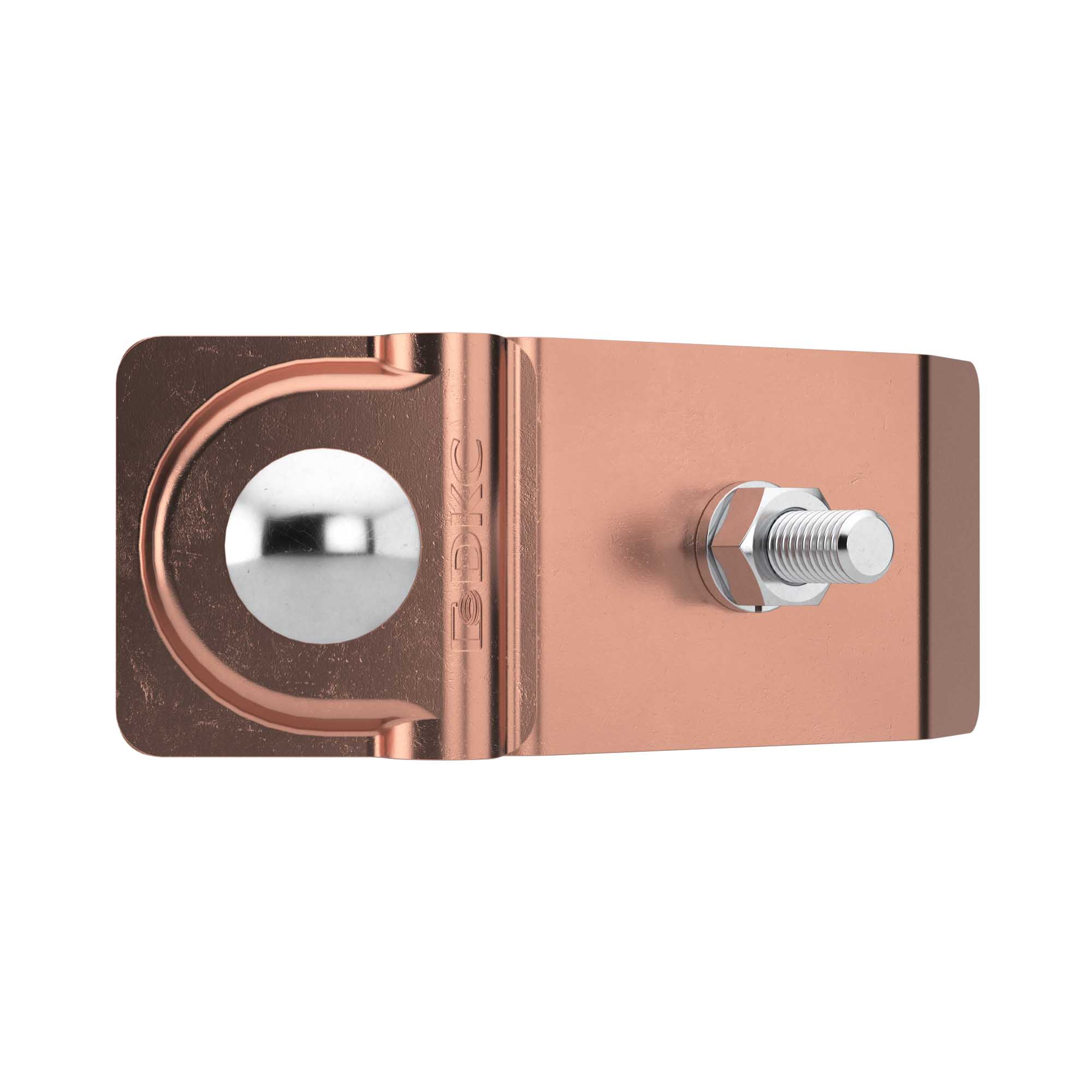 Держатель прутка на водостоке используется для крепления круглого проводника 8-10 мм к водосточным желобам. Конструкция держателя позволяет закреплять пруток как вдоль, так и поперек водостока. Способ крепления проводника - болтовой зажим. Материал - медь.