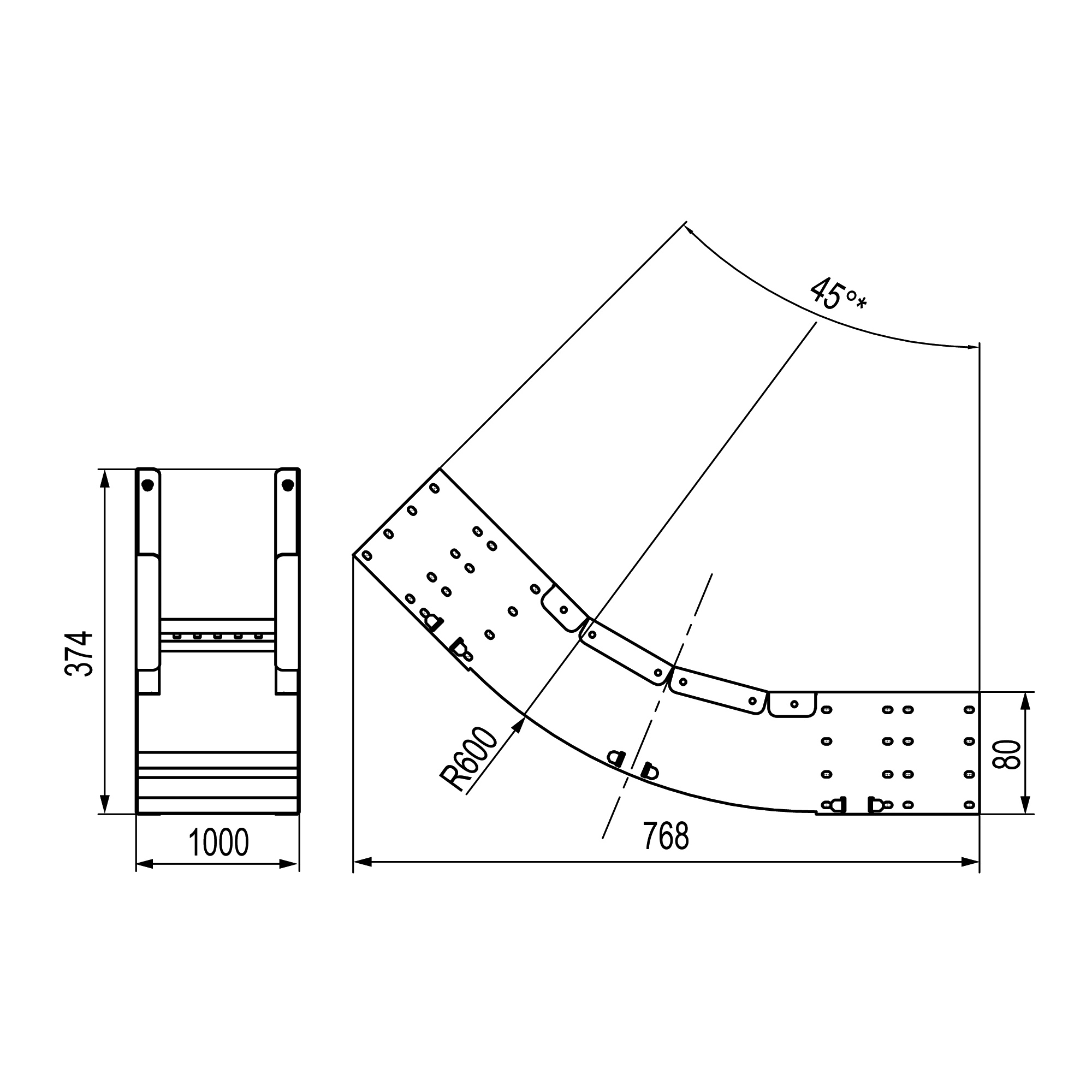 Вертикальный угол обеспечивает поворот трассы в вертикальной плоскости под углом 45 градусов. Плавность поворота облегчает прокладку силового кабеля. Направление -внутренний. Ширина -1000 мм, высота -80 мм. Исполнение - "Сендземир"