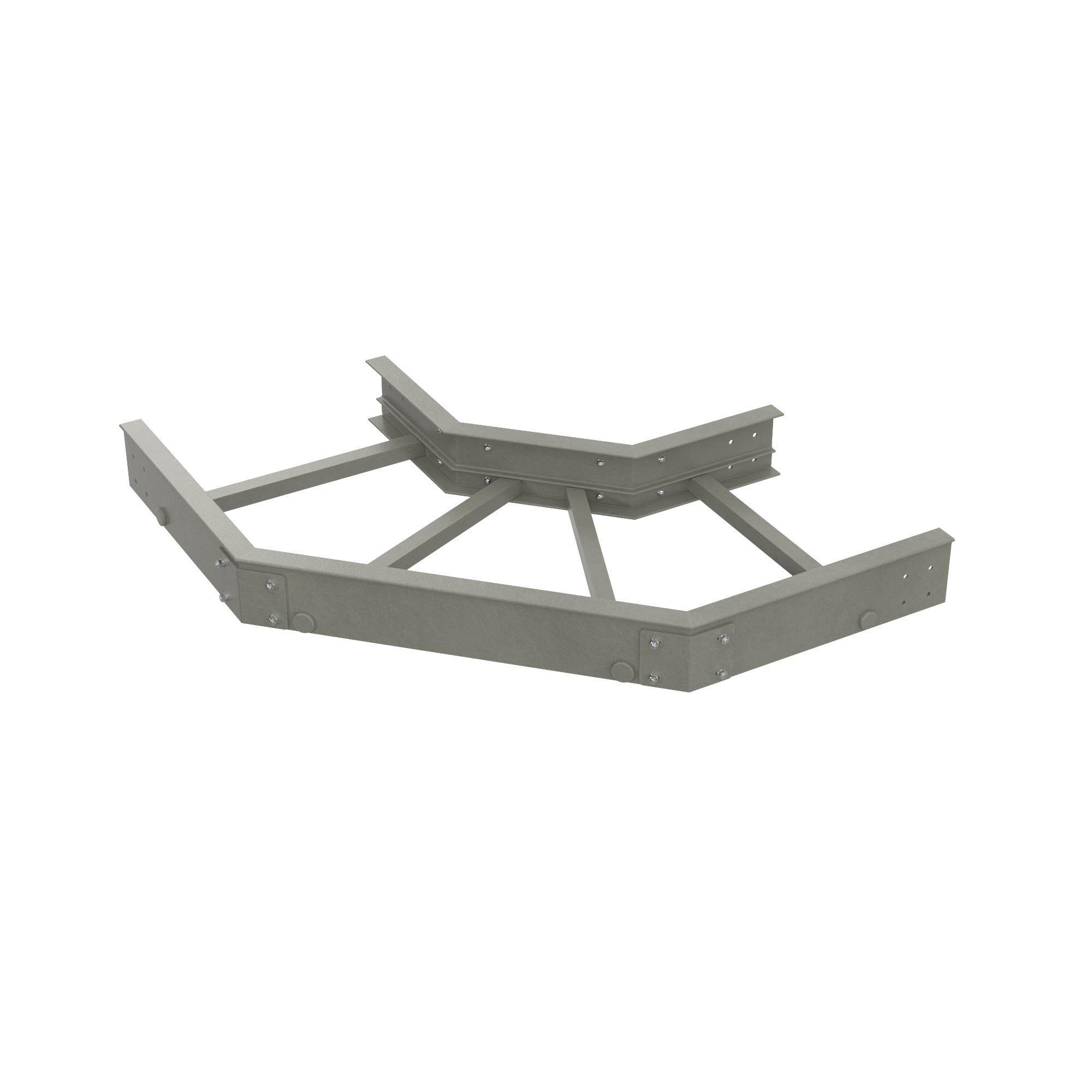 Горизонтальный угол из стеклопластика в обновленном конструктиве используется для поворота кабельной трассы в горизонтальной плоскости с разворотом открытой ее части на 90 градусов. В новом конструктиве аксессуаров минимизирована доля нержавеющих деталей, что обеспечивает однородность материала по всей трассе, а также, благодаря обновленной форме профиля, крышка на аксессуар крепится простым защелкиванием. Аксессуары из стеклопластика подходят для построения кабельных трасс в агрессивных условиях. Угол имеет радиус 300 мм; применяется с лотками шириной 900 мм и высотой 150 мм.
