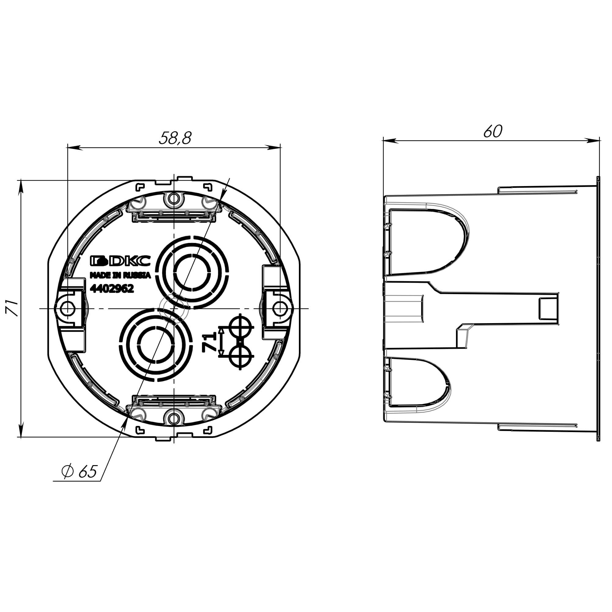 Подрозеточная коробка для полых стен – это устройство для скрытой установки изделий в стены и перегородки из гипсокартона. Подрозеточную коробку от ДКС отличают: легкость выравнивания по уровню, простота подведения проводника к механизму, возможность скрепить коробки в единый блок. Соединители поставляются отдельно. Глубина 60 мм. Для крепления электроустановочных изделий в данные коробки на винты необходимо дополнительно приобрести 2 самореза 3х25 мм.